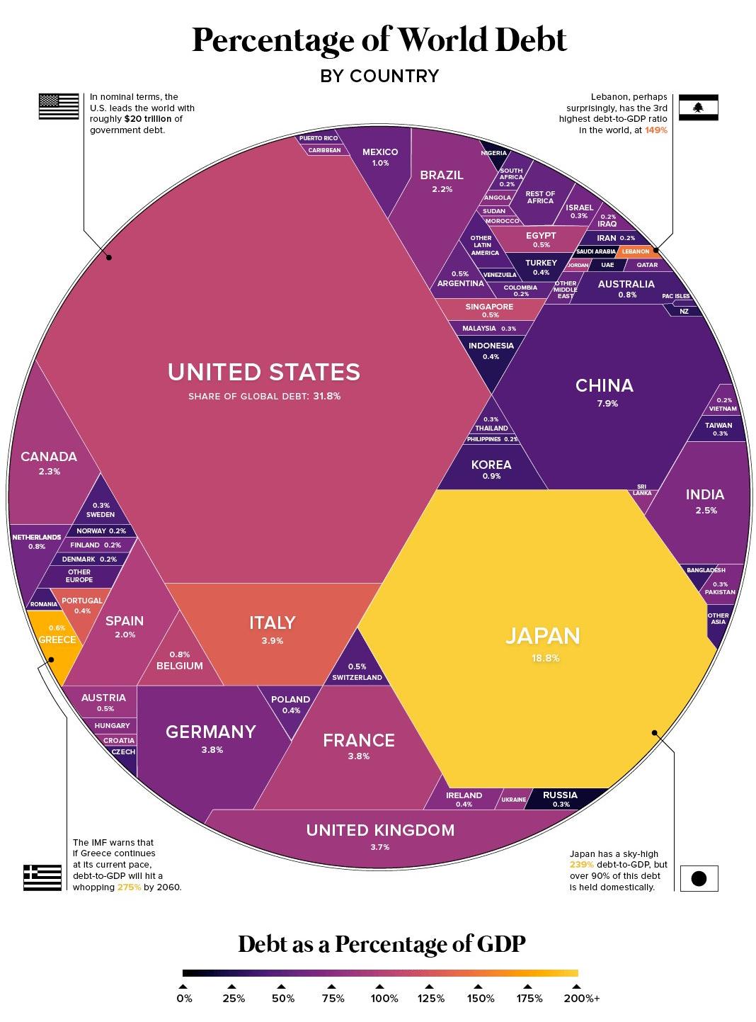 つづいて、Global debt woes hit $233 trillion, an all time highという記事=これはインドのメディアの記事ですが、そこに引用されていた。$63 Trillion of World Debt in One Visualizationという何でもわかりやすく図解してくれるサイトの画像をここに孫引用します。これは政府債務に限定しているので母数が63トリリオンになります。日付は去年10月27日だから古いものではないです。