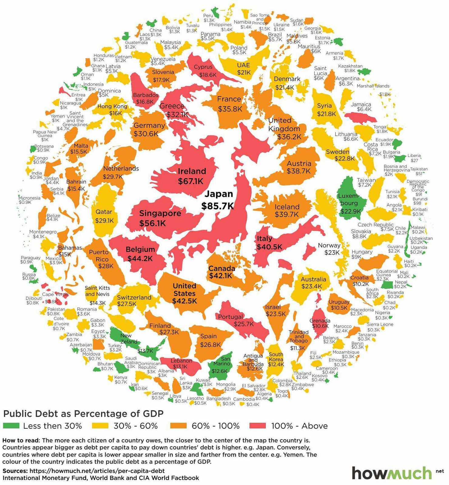 (1)借金額と国の大きさが比例してる(デカくかかれている国のほうが借金額が大きい)