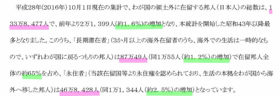17ページに書かれてます。引用するよりも該当箇所を画像化して貼り付けておきます。これでわかるのは、日本から海外に出ていってる人は約134万人であり、増えているということ。