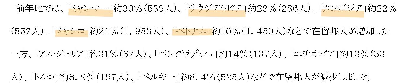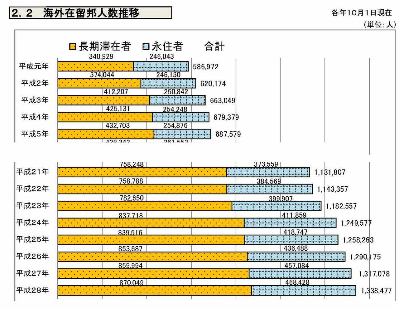 実数でいえば、長期滞在者(留学や企業駐在)65%:永住者35%ですが、伸び率でいえば永住者の方が二倍以上の伸びで増えている(増加率1.2%に対して2.5%以上)。