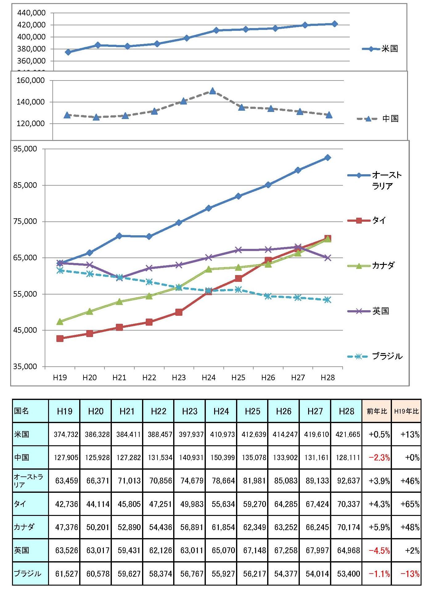 次のグラフは永住権のページでも引用したものですが、 一目瞭然とはこのことで、オーストラリア、カナダ、タイの伸び率が激しい。10年前に比べて、46%、48%、65%増です。なんでも右肩下がりのいまどきの日本で、こんな右肩上がりの現象というのは珍しい。長期推移