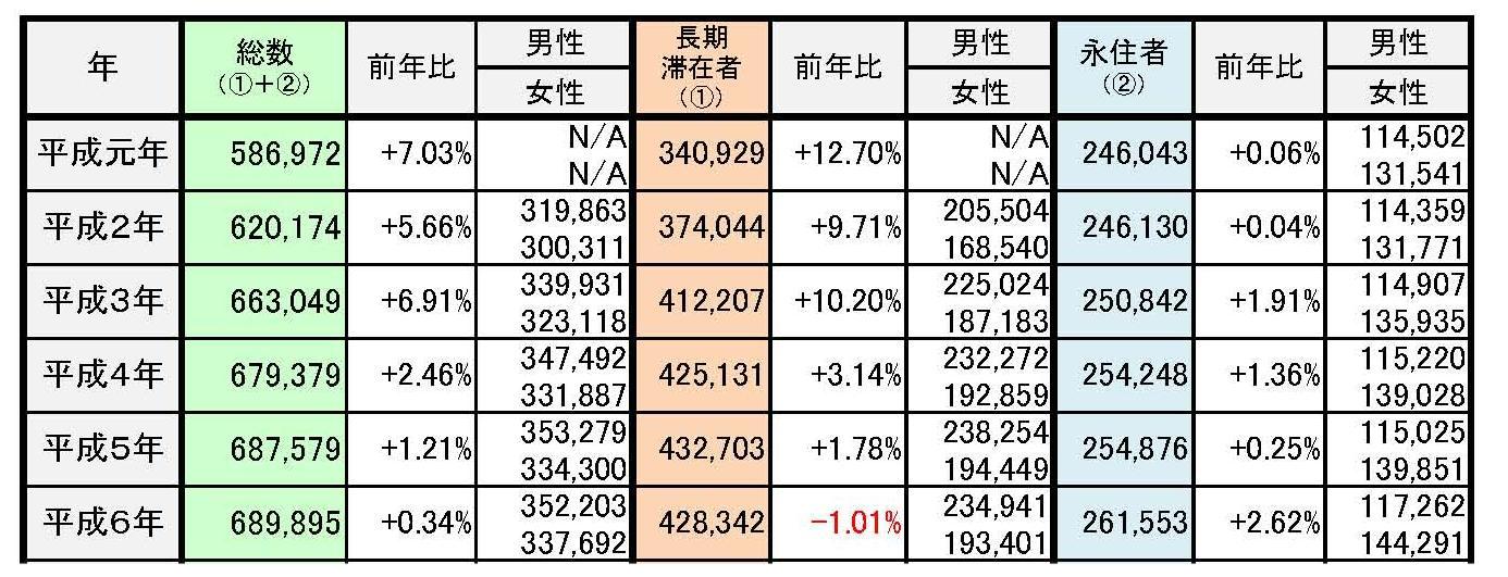 さらにこの変化の内容を見てみます。平成元年から3年くらいまでの長期滞在者(企業駐在、留学)の前年度比の伸びが凄まじいです。前年度比12%増なんてのもあります。一方、永住者の伸び率はボチボチです。0.04%なんかほとんど変化ないくらいです。