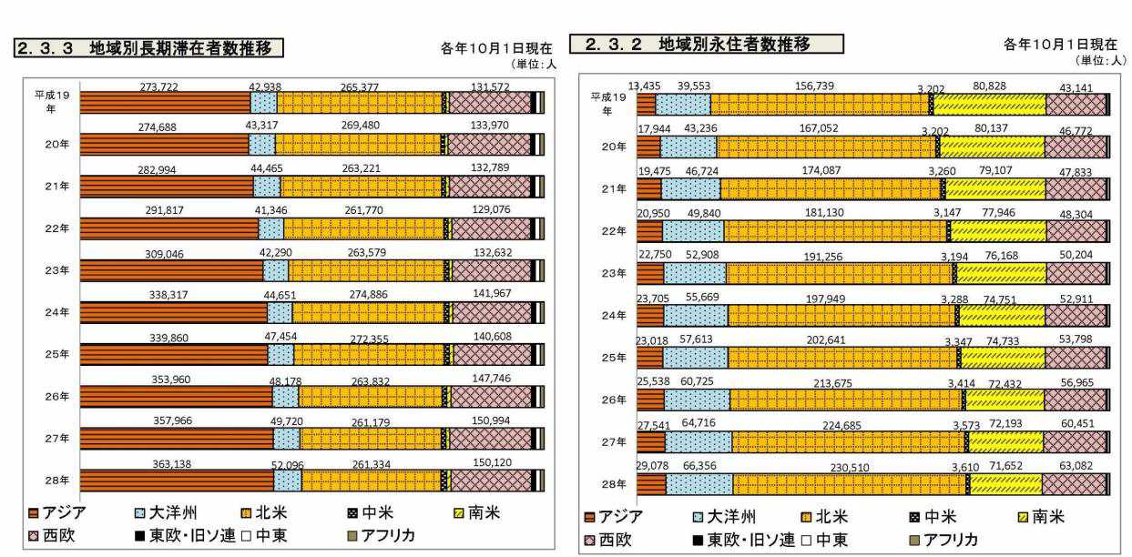 図が小さくて申し訳ないが(クリックしたら大きくなります)、これは各エリアの長期滞在と永住者数の変化を示したものです。わがオーストラリアは「大洋州」になるので、図の左から二番目の水玉模様です。左が長期滞在(企業・留学)、右が永住者です。