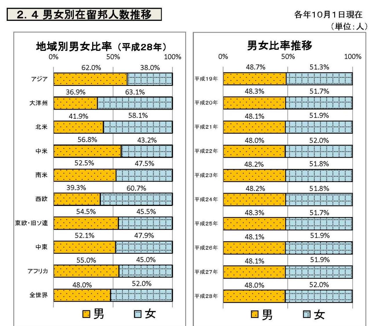 これは各エリアの男女比です。右の全エリアトータルをみると、48:52で多少女性が多いくらいなんだけど、エリア別にするとかなり違う。総じて言えば、男性が多いエリアは企業駐在が多い場所だと思います。逆に女性が多いエリアは留学や結婚永住が多いのではないかと。そしてオーストラリアの大洋州は、もう完全に女性が男性の2倍近く多いという。西欧なんかもそうですね。