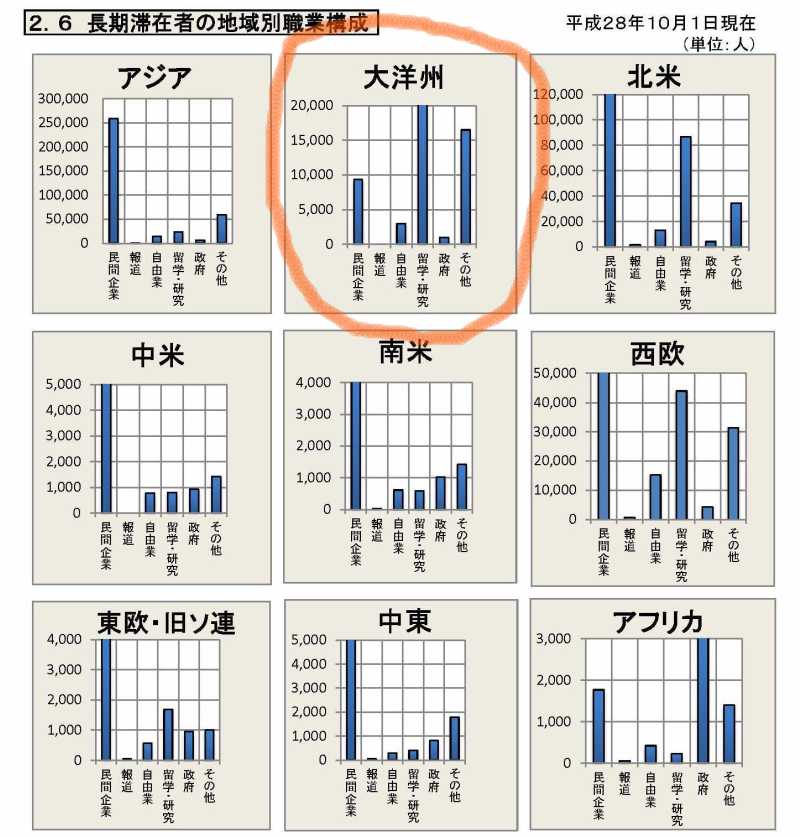 これは永住者ではなく、長期滞在者がなんで来ているのか?のエリア別分類ですが、これも興味深い。かなり露骨にわかりますよね。左端の民間企業の比率が多いのは企業駐在が多いエリアで多くのエリアがそうです。日本人の海外=企業駐在という構図が見えるんですけど、オーストラリアの大洋州だけは全然違う。留学研究が突出して多い。民間企業の2倍くらい多い。こんなエリア、ここだけです。ちなみに「その他」も多い。「その他」ってなんなの?とワーホリさんでしょう。