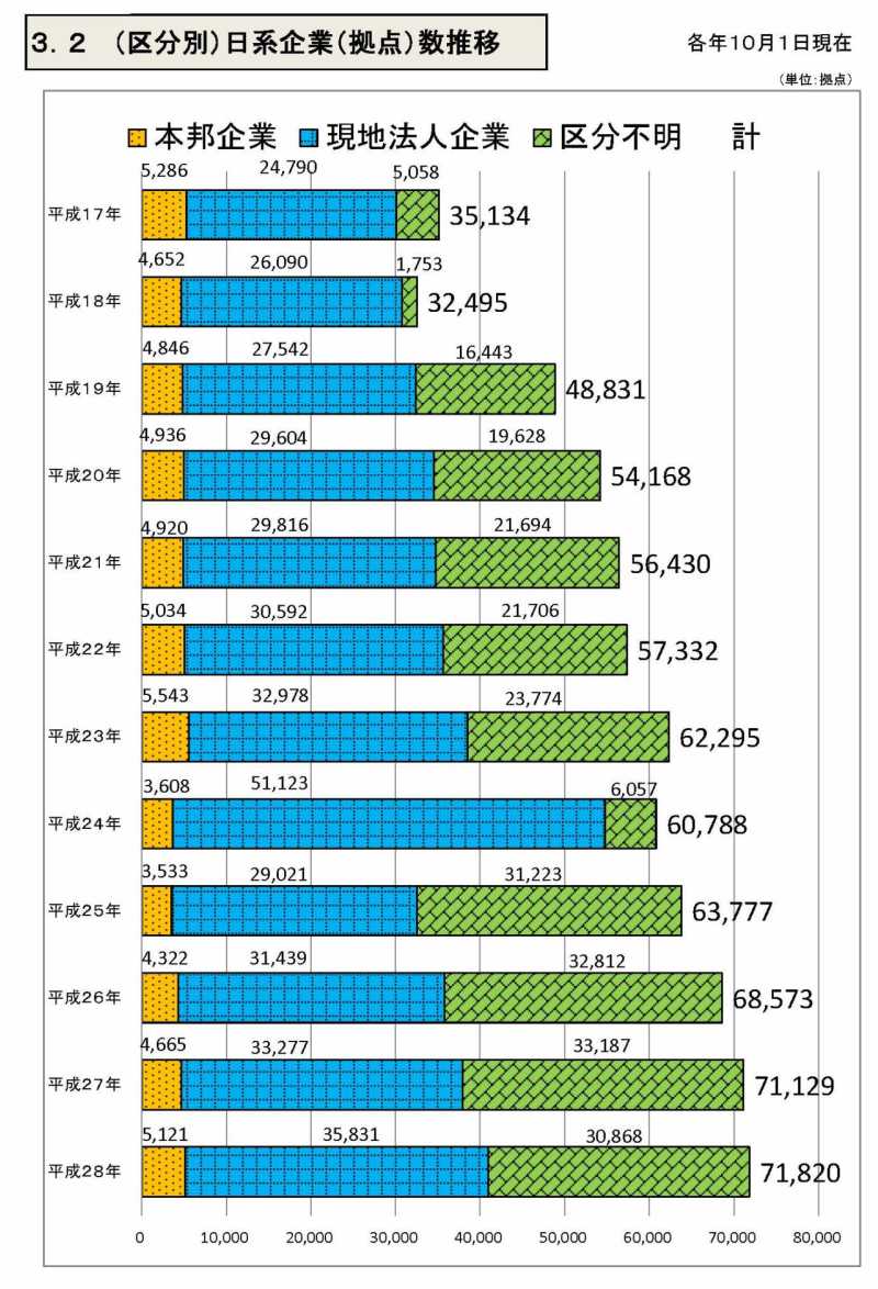 見てわかるように、日本企業の海外進出は一貫して増えています。過去10年で2倍です。国内市場が年々縮小していってるので、国内に留まるのは「座して死を待つ」に等しい以上、当然のことかと思います。ただ、推移を見てて思うのは、日本企業がそのまま来るよりも現地法人化が進んでる(平成24年だけ突出して高いのは何故なのかわかりませんが(企業買収ブームか))。